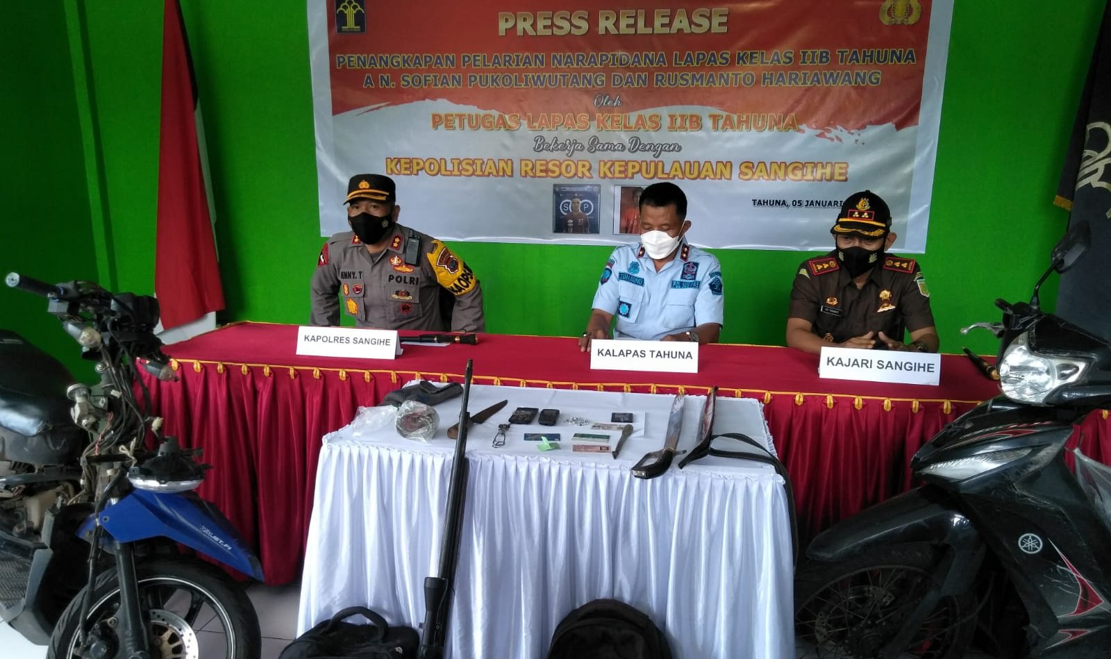 Polres kepulauan Sangihe berhasil mengamankan narapidana yang kabur dari Lembaga Pemasyarakatan (Lapas) kelas ll B Tahuna. Sebelumnya Narapidana yaitu Sofian Pukoliwutang (38) alamat Kelurahan Tona 2 Kecamatan Tahuna Timur dan Rusmanto Hariawang (38) melarikan diri dari Lapas Tahuna pada 12 Desember 2021 .