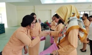 “Selamat bekerja dan berkarya kepada pengurus baru, semoga terus memberikan pengabdian terbaik, meningkatkan kapasitas diri juga melaksanakan tugas pokok dan fungsi dengan penuh tanggung jawab yang dibarengi dengan kreatifitas dan disiplin, sesuai dengan Visi Dharma Wanita Persatuan yaitu menjadi organisasi istri pegawai Aparatur Sipil Negara yang profesional untuk memperkuat peran serta perempuan dalam pembangunan bangsa,” katanya Okstan Sompie-Kalesaran saat sambutan.