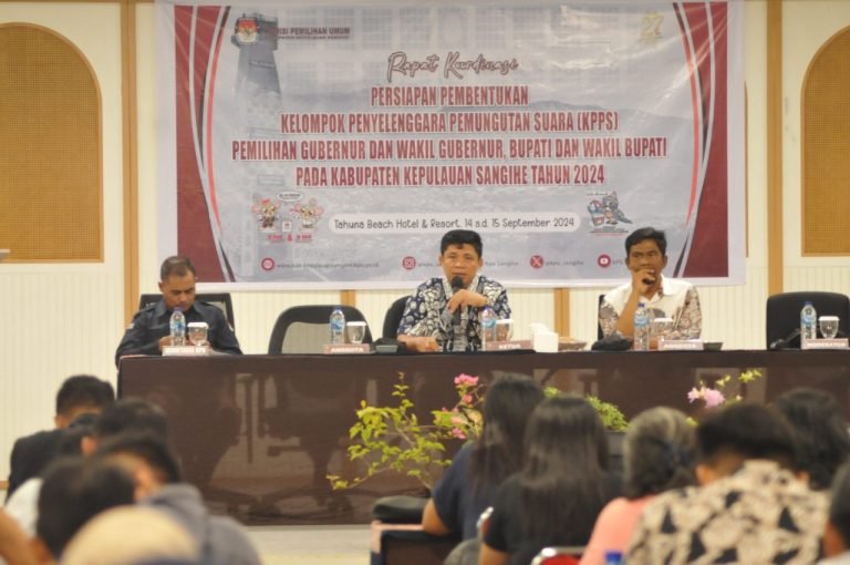 Komisi Pemilihan Umum (KPU) Kabupaten Kepulauan Sangihe menggelar Rapat Koordinasi (Rakor) terkait persiapan pembentukan Kelompok Penyelenggara Pemungutan Suara (KPPS) untuk Pemilihan Gubernur dan Wakil Gubernur, serta Bupati dan Wakil Bupati Sangihe tahun 2024.