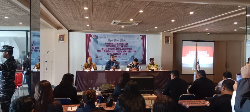 Penjabat Bupati Kabupaten Kepulauan Sangihe, Albert Huppy Wounde, turut menghadiri Rapat Pleno Terbuka Penetapan Daftar Pemilih Tetap (DPT) untuk Pemilihan Kepala Daerah (Pilkada) 2024, yang digelar pada Selasa (17/9/2024) di Tahuna Beach Hotel and Resort.