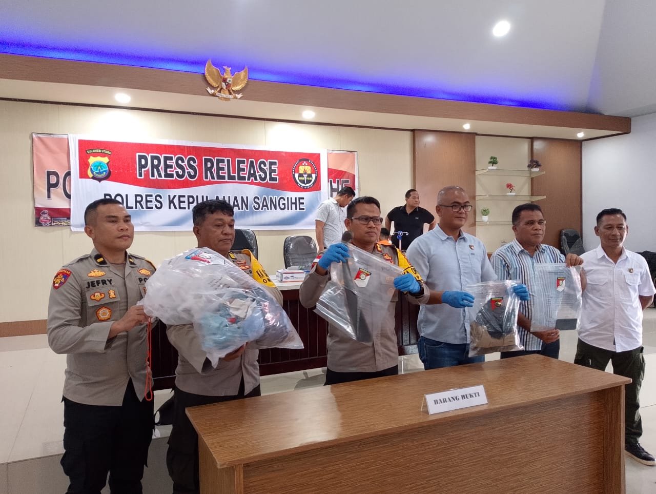 Press release tersebut dipimpin langsung oleh Kapolres Kepulauan Sangihe, AKBP Abdul Kholik SH SIK MAP didampingi Kasat Reskrim IPTU Royke Mantiri SH MH.