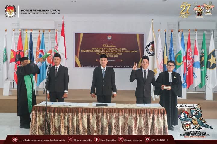 Ketua Komisi Pemilihan Umum (KPU) RI, Mochammad Afifuddin, resmi melantik tiga anggota Pengganti Antar Waktu (PAW) KPU Kabupaten Kepulauan Sangihe untuk sisa masa jabatan 2024-2028. Pelantikan berlangsung secara daring pada Selasa (26/11/2024).