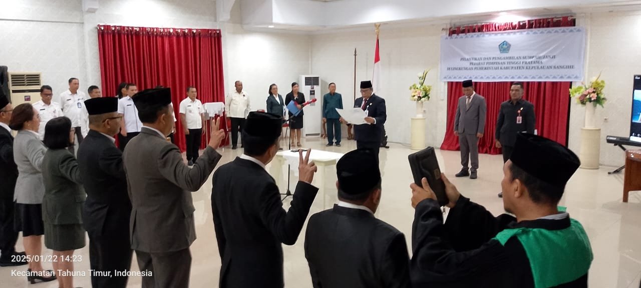 Sebanyak sebelas Pejabat Pimpinan Tinggi Pratama di lingkungan Pemerintah Kabupaten Kepulauan Sangihe resmi dilantik dan diambil sumpahnya oleh Penjabat Bupati Sangihe, Albert Huppy Wounde,Rabu (22/1/2025). Acara pelantikan berlangsung di Ruang Serbaguna Rumah Jabatan Bupati.