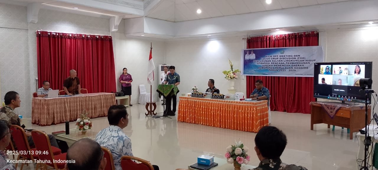 Bupati Kabupaten Kepulauan Sangihe, Michael Thungari, SE, MM, secara resmi membuka kegiatan Kick Off Meeting dan Focus Group Discussion (FGD) penyusunan Kajian Lingkungan Hidup Strategis (KLHS) untuk Rencana Pembangunan Jangka Menengah Daerah (RPJMD) Kabupaten Kepulauan Sangihe Tahun 2025-2029. Kegiatan ini berlangsung di ruang serbaguna rumah jabatan Bupati, Kamis (13/3/2025).