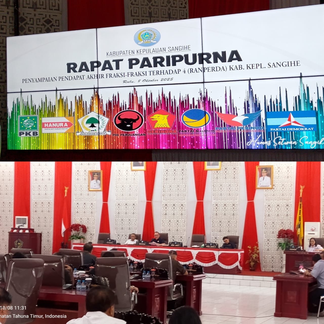 Dewan Perwakilan Rakyat Daerah (DPRD) Kabupaten Kepulauan Sangihe menggelar rapat paripurna dengan agenda penyampaian pendapat akhir fraksi-fraksi terhadap empat Rancangan Peraturan Daerah (Ranperda), Rabu (8/10/2025).