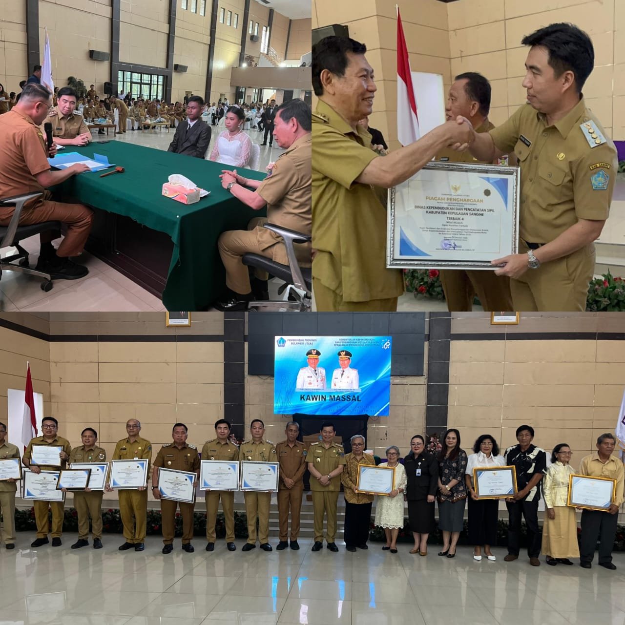 Selain menghadiri kegiatan pernikahan massal, Bupati Michael Thungari juga menerima penghargaan dari Pemerintah Provinsi Sulawesi Utara atas prestasi Dinas Kependudukan dan Pencatatan Sipil (Dukcapil) Kabupaten Kepulauan Sangihe.