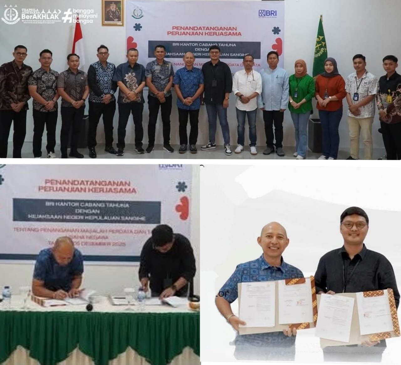 Kejaksaan Negeri (Kejari) Kepulauan Sangihe bersama PT Bank Rakyat Indonesia (Persero) Kantor Cabang Tahuna resmi menjalin kerja sama melalui Penandatanganan Perjanjian Kerja Sama terkait Penanganan Masalah Hukum Perdata dan Tata Usaha Negara (TUN). Acara ini digelar di Aula Kejaksaan Negeri Kepulauan Sangihe pada Jumat (5/12/2025).