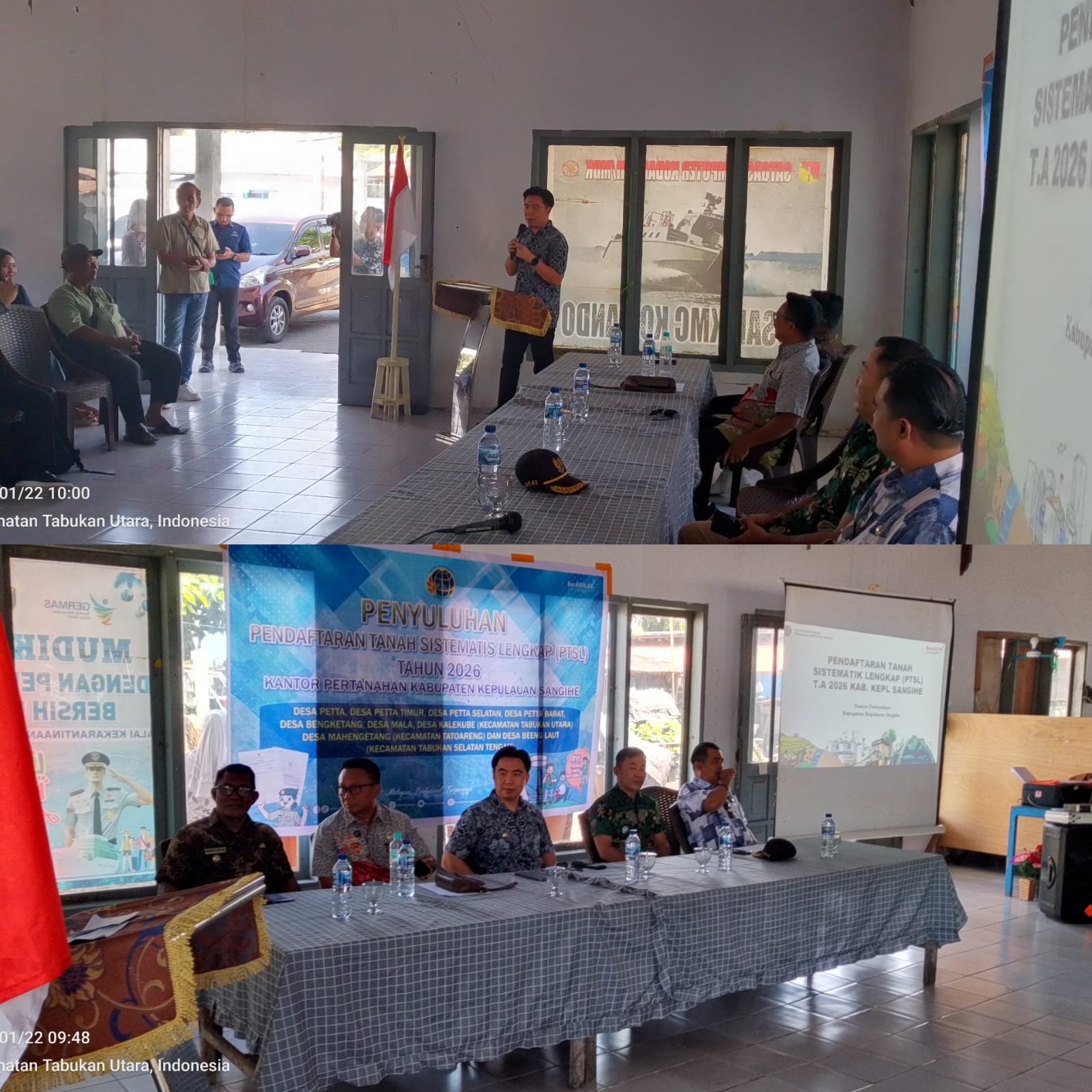 Penyuluhan PTSL Tahun 2026 di Kecamatan Tabukan Utara mencakup beberapa wilayah, yakni Kampung Petta, Petta Timur, Petta Barat, Petta Selatan, Mala, Bengketan, dan Kalekube.